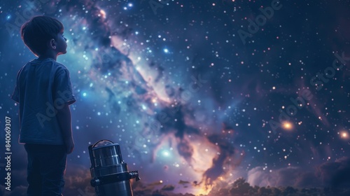 The watermark will not be included on Wall mural.: Young boy looking at galaxies and constellations during a night of stargazing -