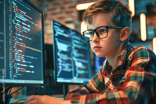 Wall mural : Young boy with glasses engrossed in coding on a computer in a dark room, displaying his focus and ea