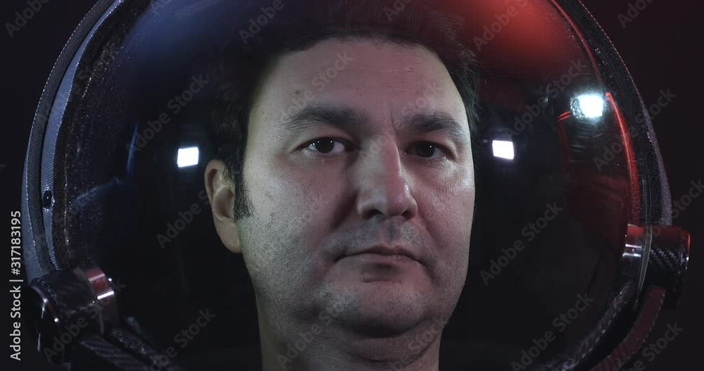 Wall mural : Young brave male astronaut in space helmet looking at camera slowly - he is exploring outer space in