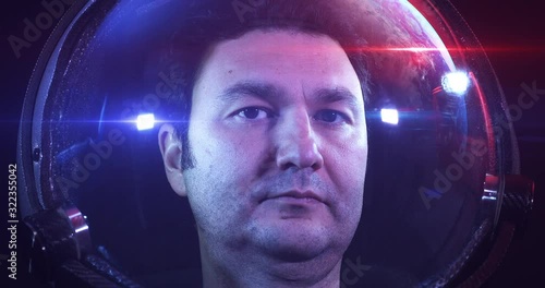 The watermark will not be included on Wall mural.: Young brave male astronaut in space helmet looking at camera slowly - he is exploring outer space in