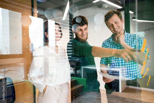 The watermark will not be included on Wall mural.: Young business team planning workflow using memorable cards during brainstorming while standing behi
