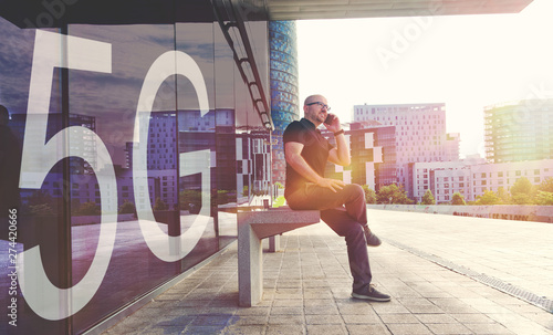 Young businessman using a smartphone with the new 5g mobile network - urban scene in the street and eWall mural