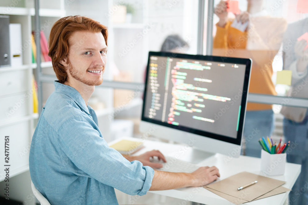 The watermark will not be included on Wall mural.: Young cheerful and successful programmer or webdesigner sitting by desk in front of computer screen