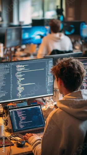 Wall mural : Young developer coding on multiple screens in tech workspace