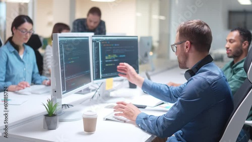 Wall mural young engineers working on computers and communicating. african american programmer looking at displ