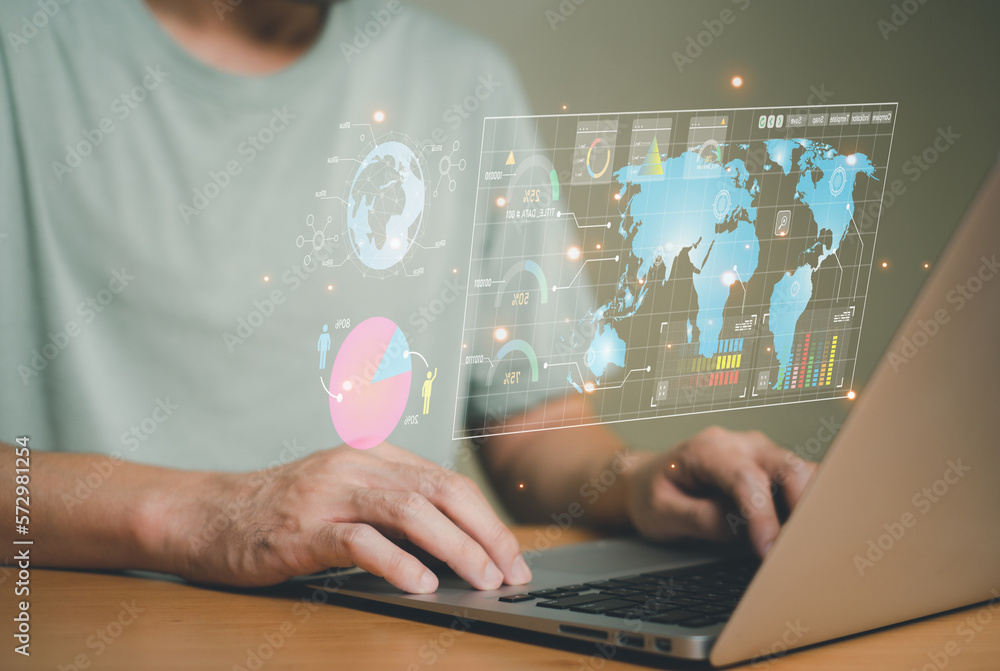 Wall mural : Young entrepreneur using big data analysis and cloud technology to collect customer data and display
