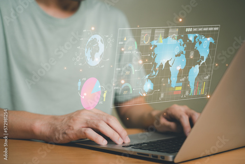Wall mural young entrepreneur using big data analysis and cloud technology to collect customer data and display