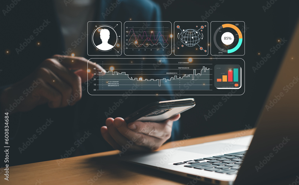 Wall mural young entrepreneur using big data analysis and cloud technology to collect customer data and display