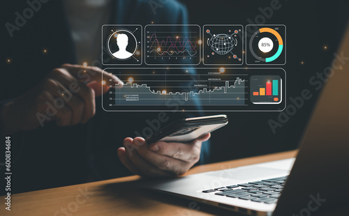 The watermark will not be included on Wall mural.: Young entrepreneur using big data analysis and cloud technology to collect customer data and display