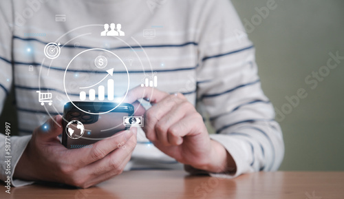 Wall mural : Young entrepreneur using big data analysis and cloud technology to collect customer data and display