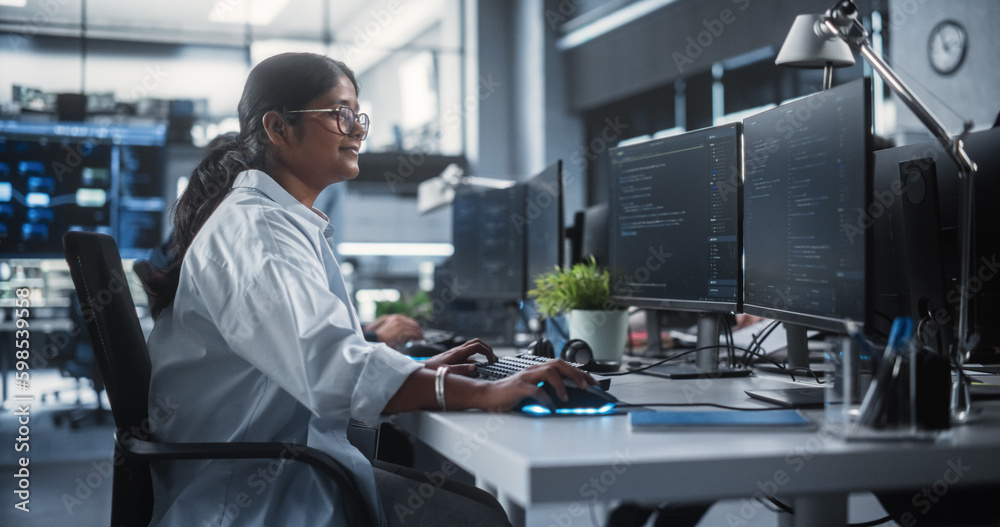 The watermark will not be included on Wall mural.: Young female artificial intelligence engineer working on computer in a technological office - young i