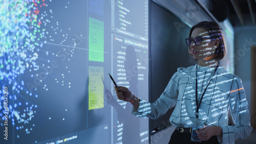 The watermark will not be included on Wall mural.: Young female teacher giving a data science presentation in a dark auditorium with projecting slidesh