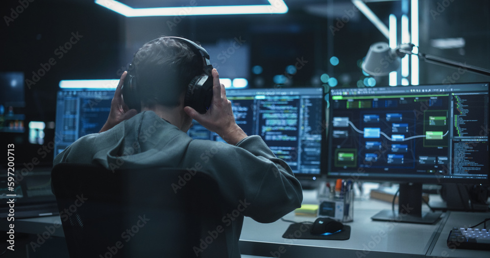 The watermark will not be included on Wall mural.: Young hacker working alone, hacking corporate data servers from his underground hideout - hacktivist