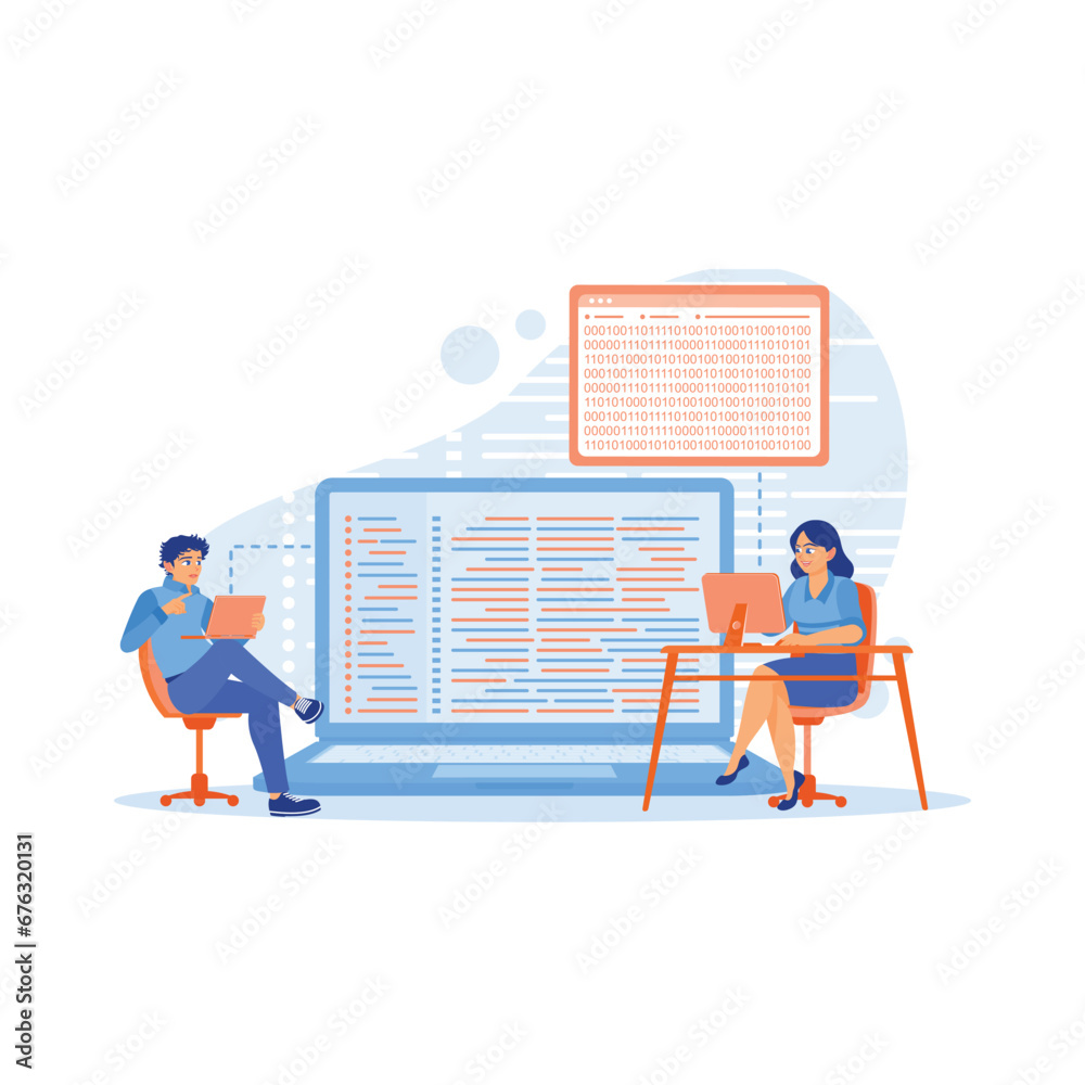 The watermark will not be included on Wall mural.: Young it programmer and it software team brainstorming and programming on a laptop computer - working