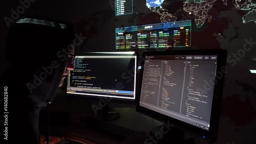 The watermark will not be included on Wall mural.: Young it programmer prints the code on the computer in dark office room