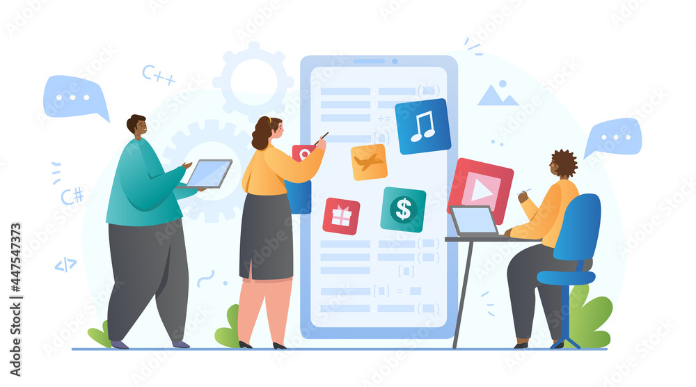 Wall mural young male and female characters are developing application together. cheerful designers are creatin - Wall murals Wall mural young male and female characters are developing application together. cheerful designers are creatin - Wall murals