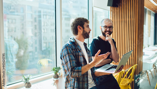 Wall mural young male colleagues with laptop computer discussing web projecting during collaborative brainstorm - Wall murals Wall mural young male colleagues with laptop computer discussing web projecting during collaborative brainstorm - Wall murals