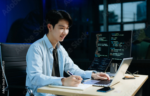 The watermark will not be included on Wall mural.: Young male programmer working with tablet and screen displaying code - modern tech office setup, grea