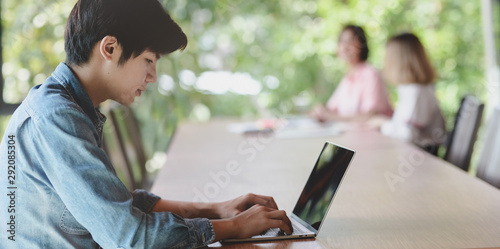 Wall mural young male ui web developer working on his project about ux template with his coworker - Wall murals Wall mural young male ui web developer working on his project about ux template with his coworker - Wall murals