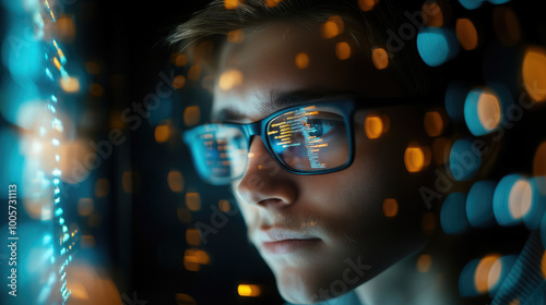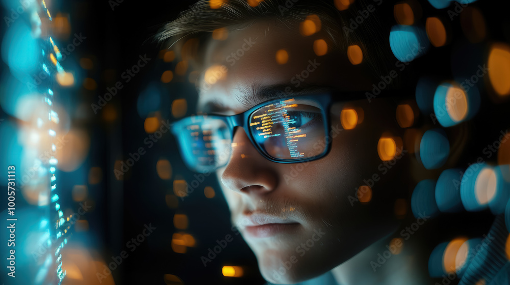 Wall mural : Young man with glasses programming on computer screen, lines of code, science, programmer, scientist