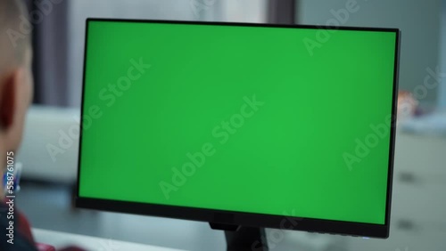Wall mural young man working at computer with green mock up screen sitting at desk in office. desktop computer  - Wall murals Wall mural young man working at computer with green mock up screen sitting at desk in office. desktop computer - Wall murals