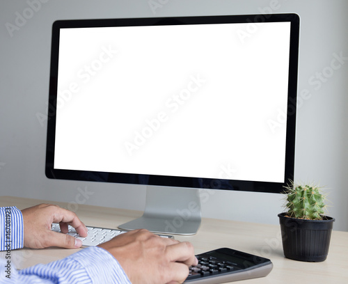 Wall mural : Young man working businessman using a desktop computer of the blank screen