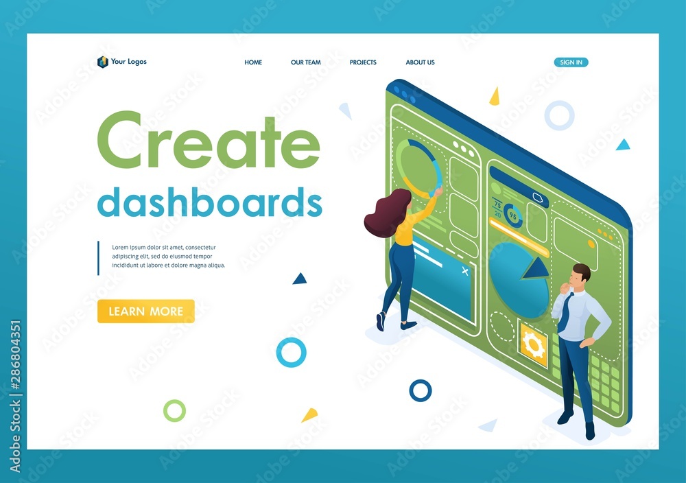 Wall mural : Young people are working on creating a dashboard with an individual menu - design concept - 3d isometr