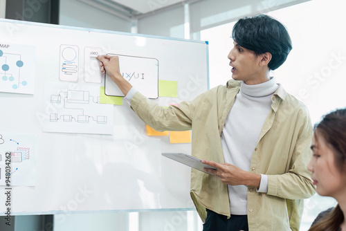 The watermark will not be included on Wall mural.: Young professional presenting ux ui design concepts on whiteboard in modern office setting