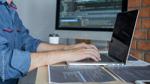 The watermark will not be included on Wall mural.: Young professional programmer working at developing programming and website working in a software de