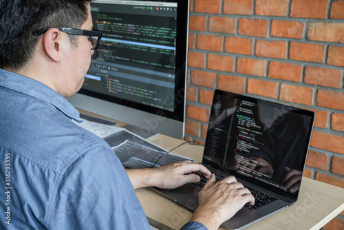 The watermark will not be included on Wall mural.: Young professional programmer working at developing programming and website working in a software de
