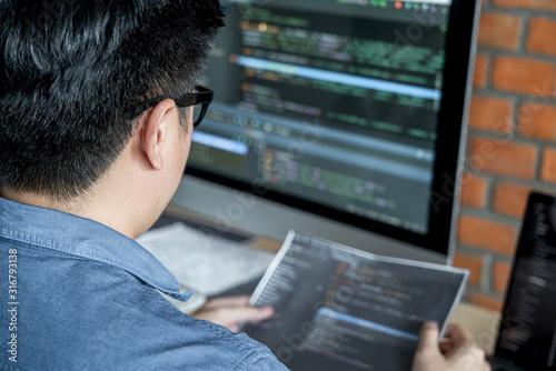 Wall mural young professional programmer working at developing programming and website working in a software de