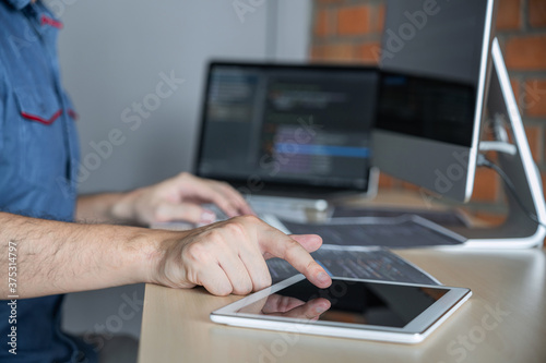 The watermark will not be included on Wall mural.: Young professional programmer working at developing programming and website working in a software de