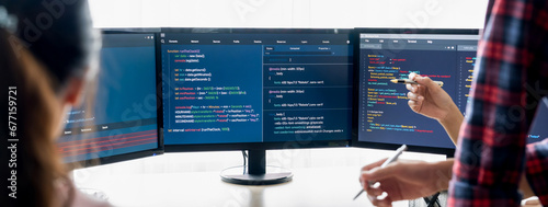 The watermark will not be included on Wall mural.: Young professional website developer and cooperative computer engineer team brainstorming and sharin