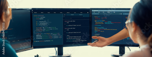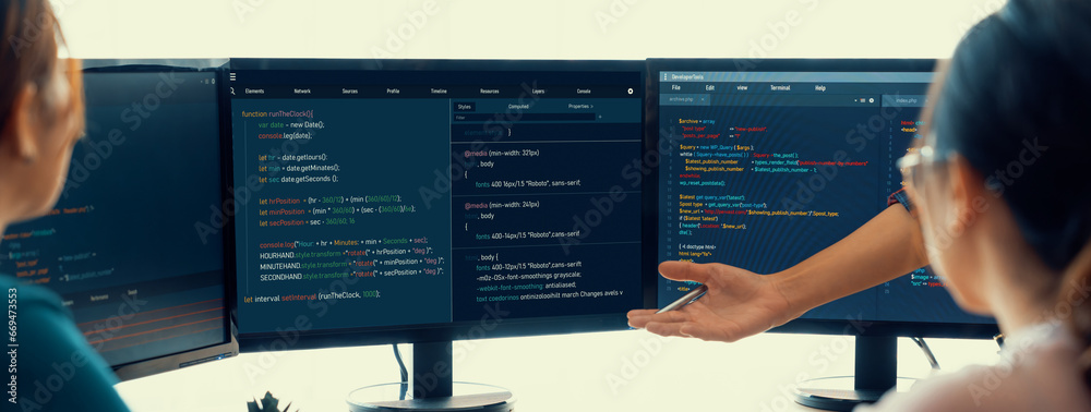 The watermark will not be included on Wall mural.: Young professional website developer and cooperative computer engineer team brainstorming and sharin