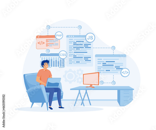The watermark will not be included on Wall mural.: Young programmer concentrated at working project - developing programming and coding technologies - fl