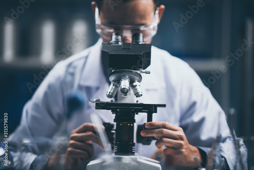 Wall mural young scientist looking through a microscope in a laboratory. young scientist doing some research.