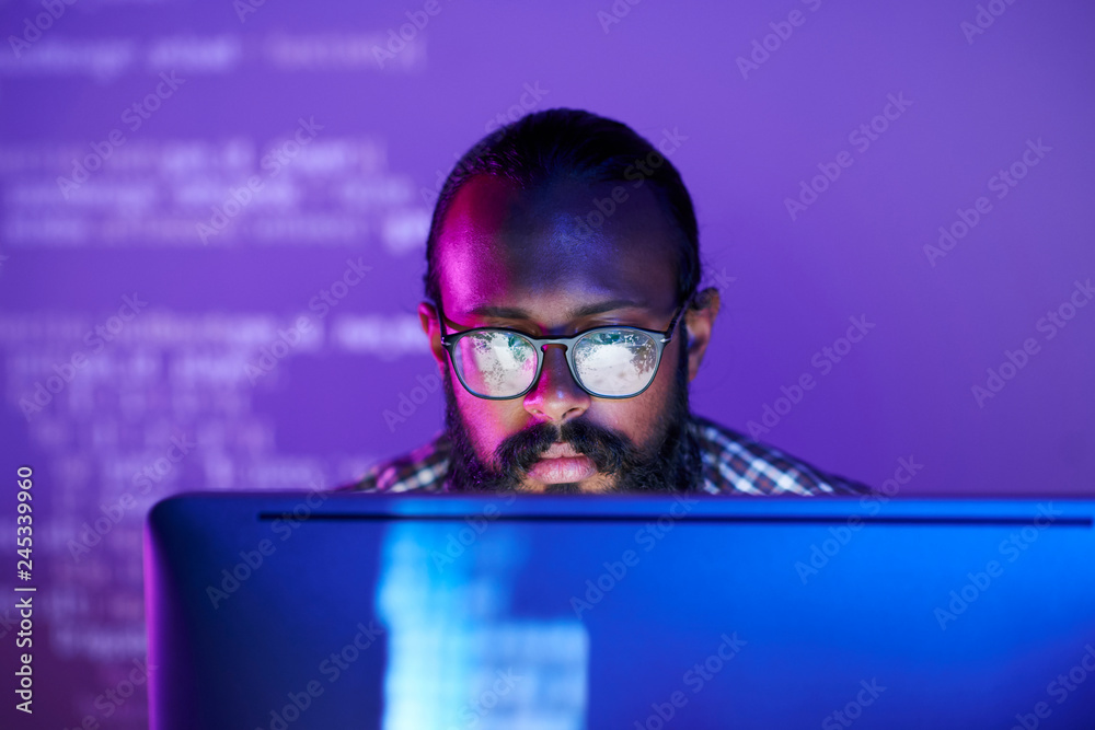 The watermark will not be included on Wall mural.: Young serious programmer in eyeglasses concentrating on working with coded data on computer screen