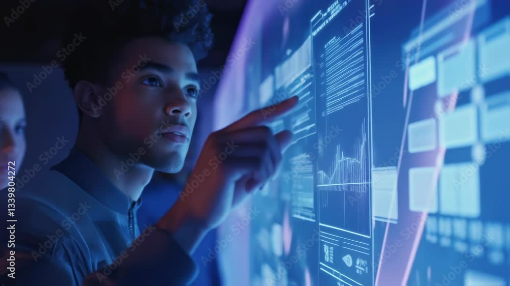 Young software developer analyzing holographic futuristic data on a transparent display, with colleaWall mural