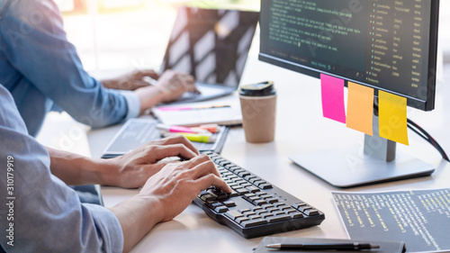 Wall mural : Young startup programmers sitting at desks working on computers screen for developing programming an