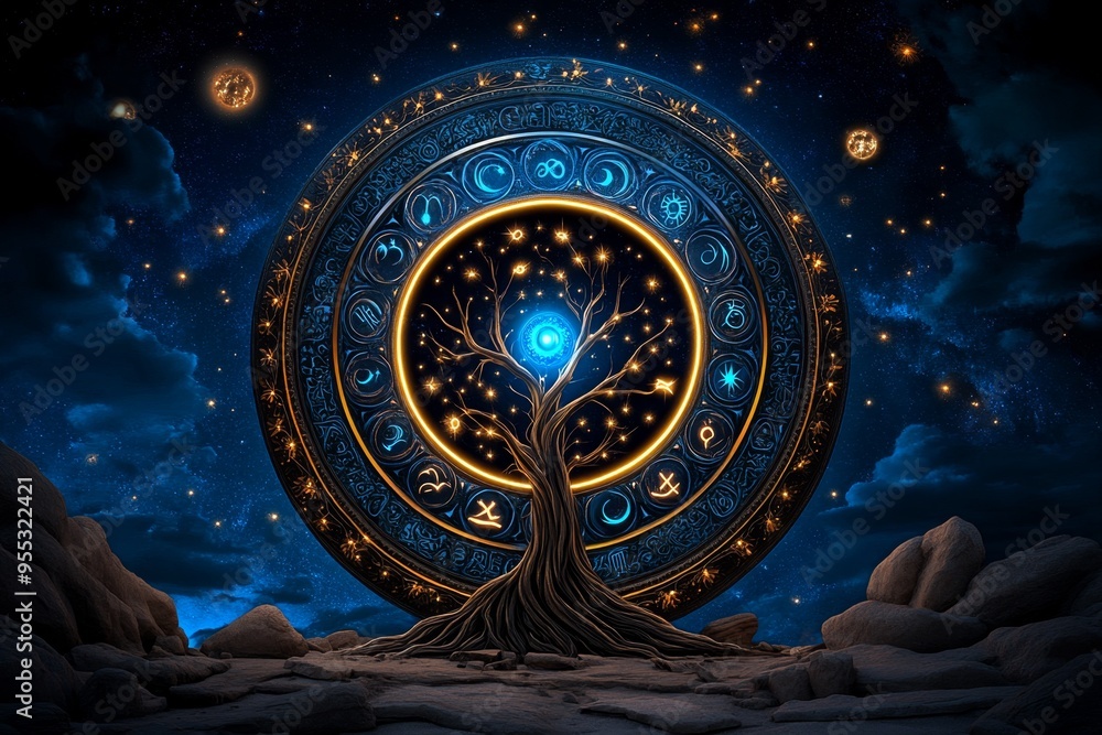 Wall mural : Zodiac signs in a celestial family tree, captured in an artwork where the zodiac signs are branches
