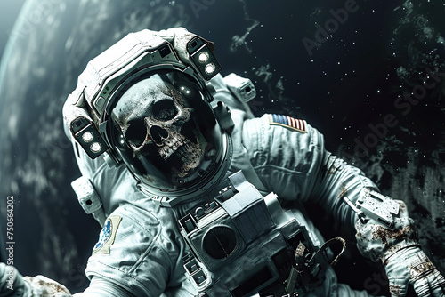 The watermark will not be included on Wall mural.: Zombie skeleton astronaut in spacesuit floating in space illustration -